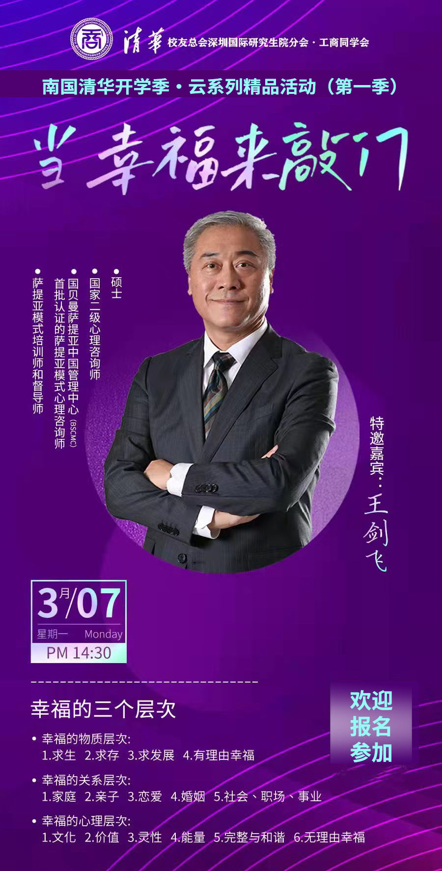 【南国清华开学季·云系列精品活动】3月7日 心理专家分享《当幸福来敲门》